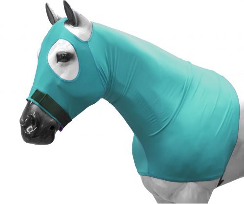 Form fitting Lycra Pull on slicker hood. Made of form fitting, breathable Lycra® for a custom fit. Soft elastic band around nose and a girth line with sure grip velcro for a secure fit and helps keep material away from eyes and ears. Nose band is lined with soft fleece for comfort and heavy stitched seams to prevent rips.